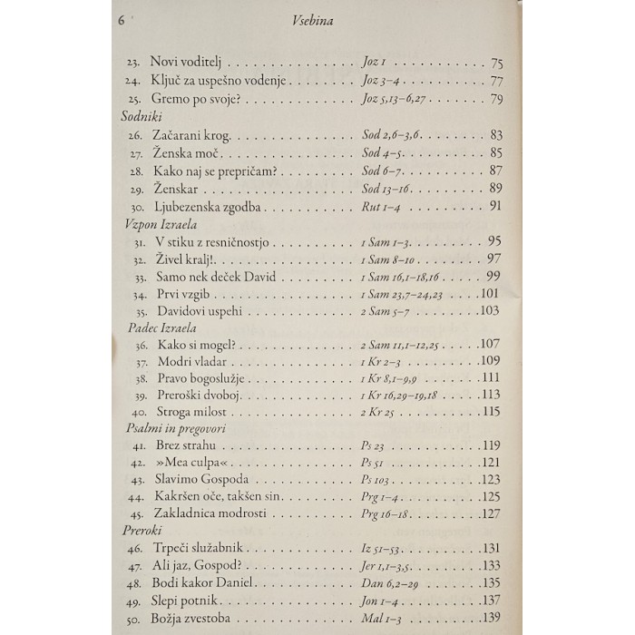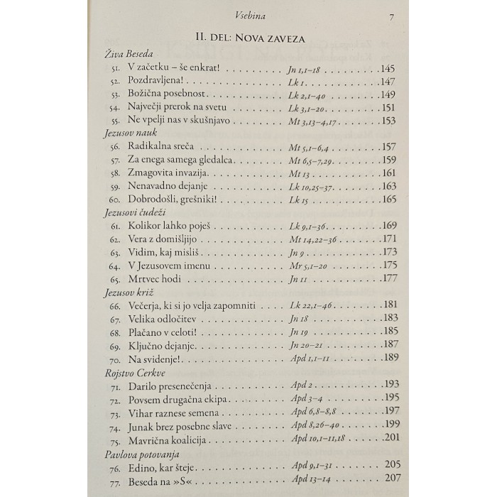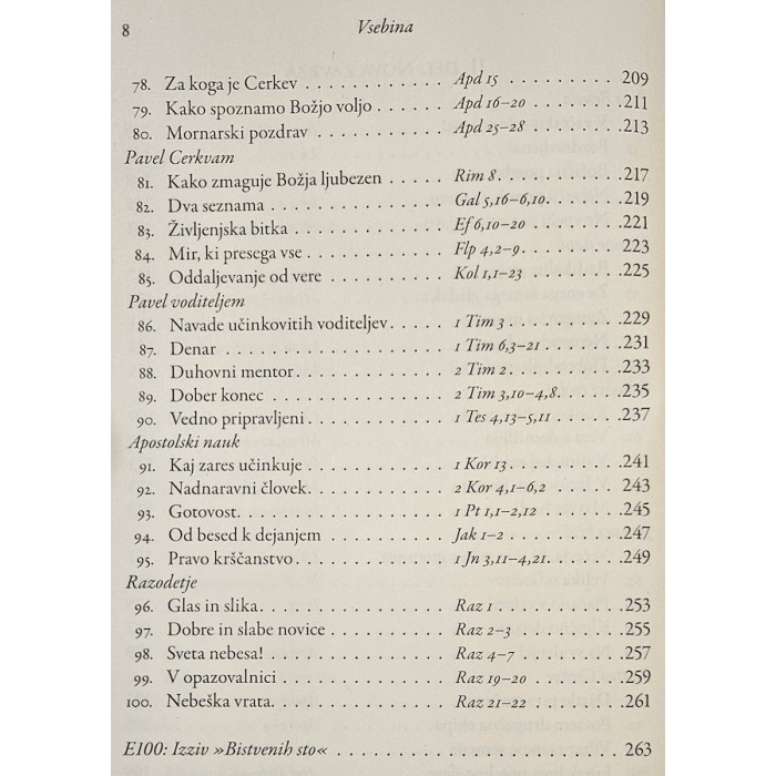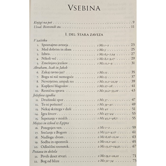 Potujte v osrčje Svetega pisma s pomočjo stotih skrbno izbranih odlomkov. V vsak odlomek smo uvedeni s kratko molitvijo, s premišljevanjem in s spodbudo, kako prebrano prenesti v vsakodnevno življenje. Knjiga bo poglobila vaše poznavanje Svetega pisma ali pa vas na enostven način uvedla v branje. Z njo bo branje Svetega pisma veliko lažje, še posebej za še ne izkušene bralce.