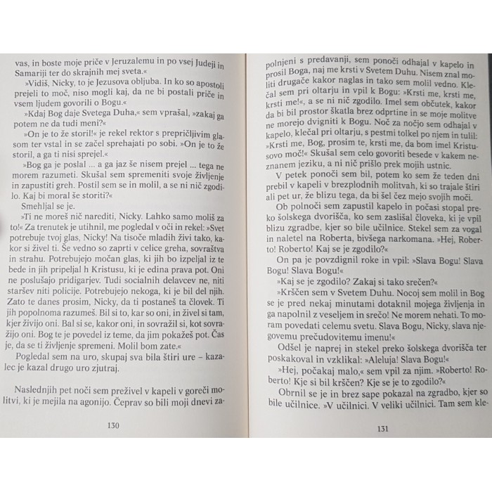 »Ne bojim se te, Nicky. Res je, da zelo groziš, toda v duši si isti kakor vsi mi, osamljen si in prestrašen. Poln si grehov in sit vsega. Toda zapomni si, Jezus te ljubi!«